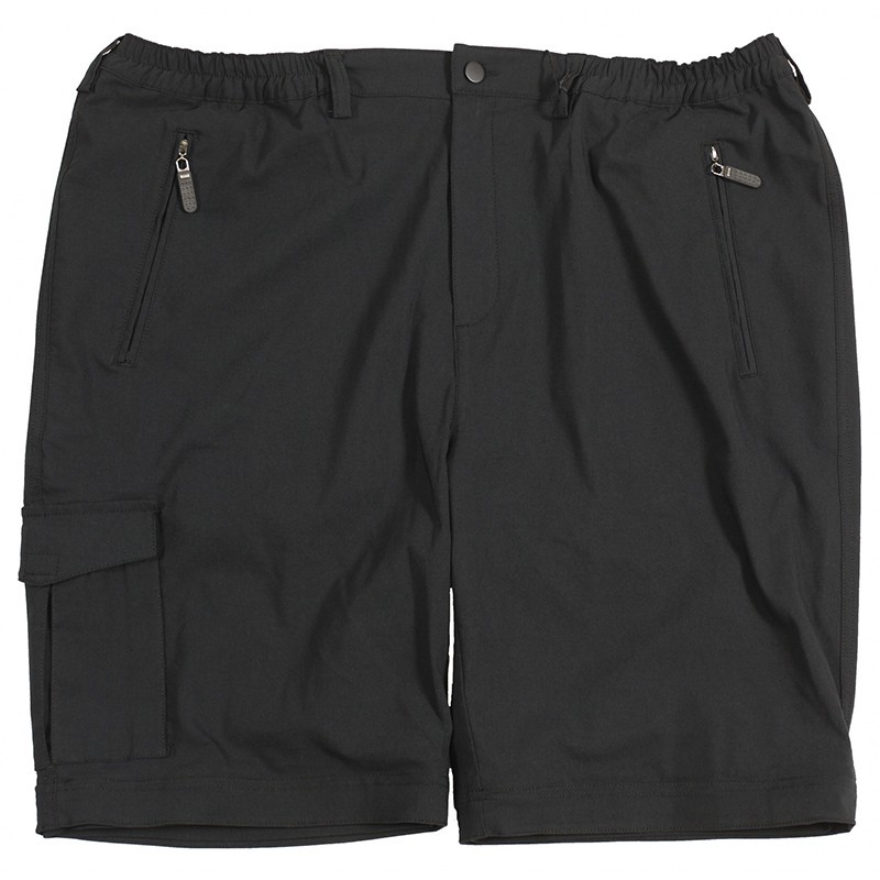 Bermuda grande taille homme. Ceinture 3/4 élastique avec passants. Braguette zippée et bouton ton sur ton. 2 poches italiennes zippées + 1 poche arrière zippée + 1 poche cargo avec velcro. Léger avec séchage rapide. 70% polyester 24% coton 6% élasthanne.